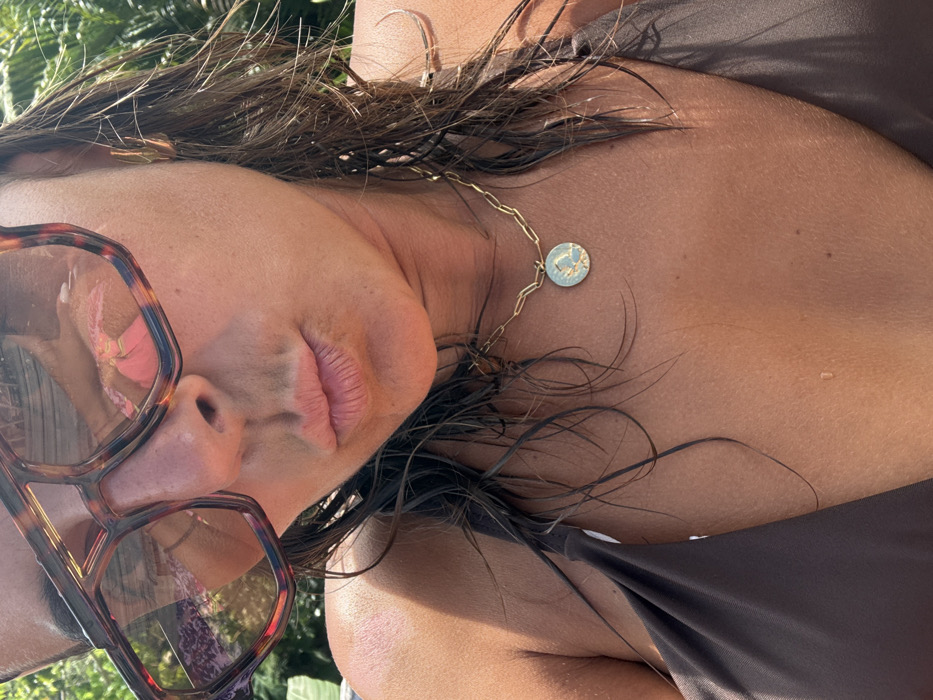 A person in sunglasses, lying in the sun. Wet hair is loosely arranged around the face and neck. A gold necklace with a circular pendant sits just below the collarbone. A brown bathing suit strap is visible on the right side of the frame. The background suggests a tropical or outdoor setting with hints of greenery and bright sunlight.