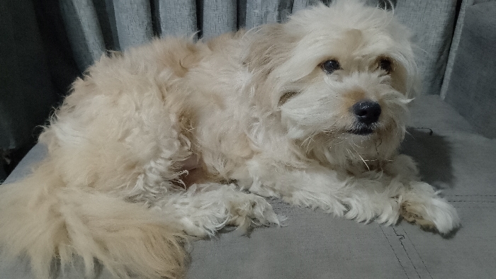 An indoor photograph captures a light-colored, shaggy-haired dog lying on a gray upholstered couch or armchair. The dog, exhibiting cream or light tan fur, dark eyes, and a dark nose, is positioned with its body facing left and its head turned towards the viewer. Its front paws are extended, and its tail is curled along its left side. The gray fabric furniture features visible stitching details. In the background to the left, light blue/gray curtains with vertical folds are visible. The scene is located within a residence in San Juan de Lurigancho, Peru.