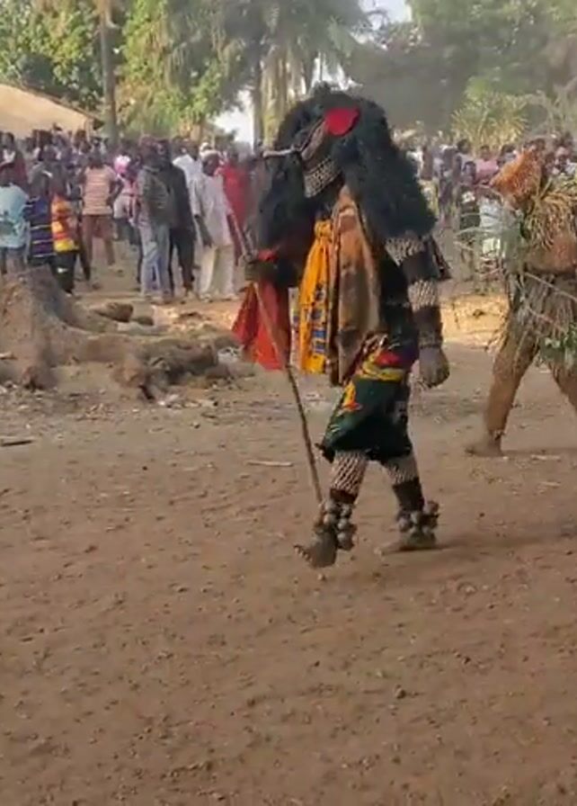 two figures wearing elaborate costumes dancing in a dusty, open area. One costume is predominantly black with touches of yellow and red, and the figure carries a long wooden pole. The other costume appears to be made of dried grasses and foliage. Both figures are barefoot. They are surrounded by a large crowd of onlookers, and in the foreground, a person wearing a black t-shirt with a colorful design is partially visible. Palm trees and buildings can be seen in the background. The overall atmosphere suggests a cultural or traditional performance taking place in a village or community setting.