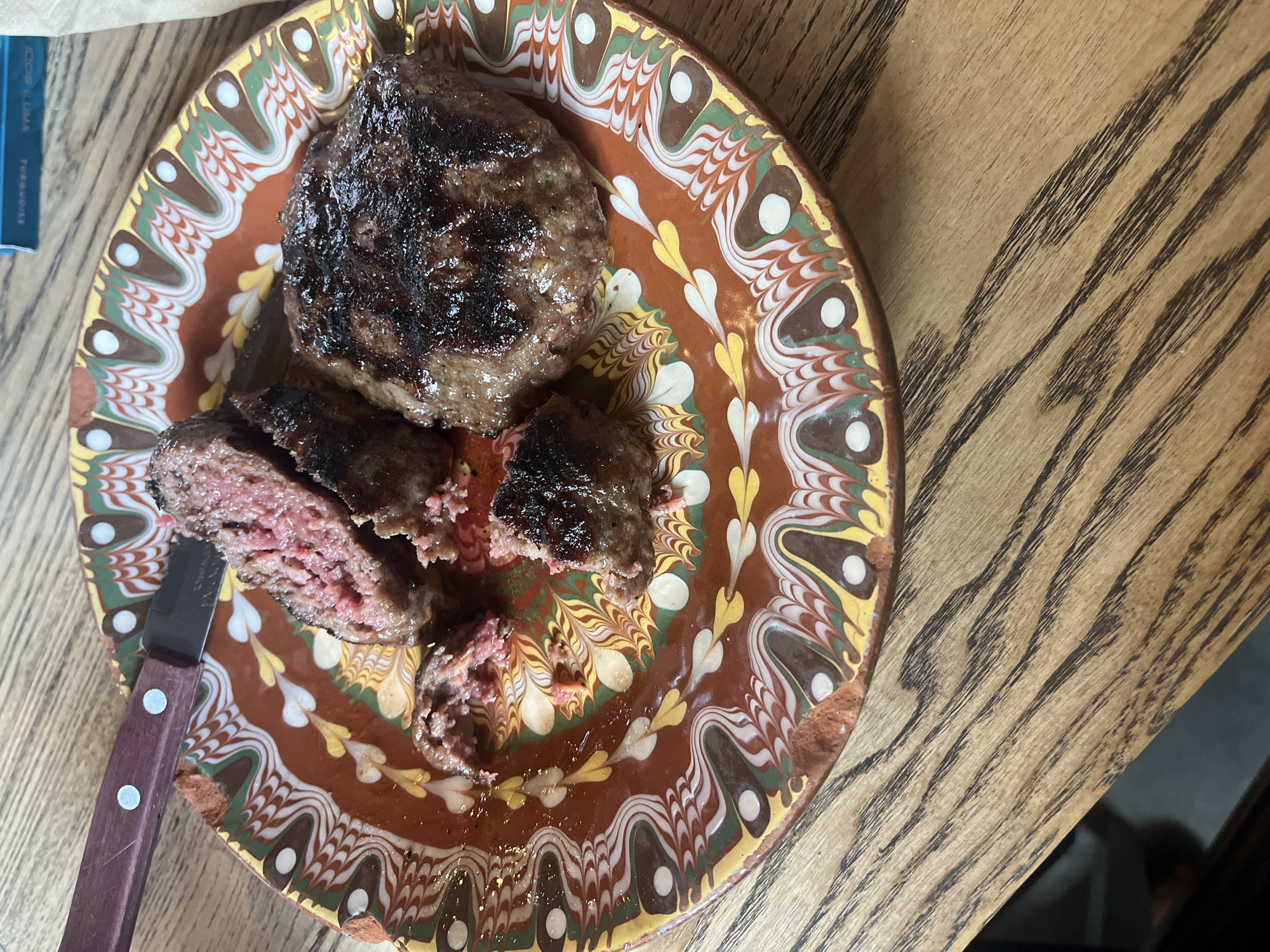 A medium-shot, top-down image shows a plate with food on a wooden surface. The plate is circular with a complex, colorful pattern around the edge featuring repeating shapes in brown, white, green, and yellow. On the plate is a partially eaten ground meat patty with a dark brown, almost burnt exterior. Some pieces of the patty have been cut, revealing a reddish-pink interior. A knife with a brown wooden handle rests on the plate. The wooden surface has a visible grain pattern. This is likely a kebabche, a grilled ground meat dish popular in Bulgaria, served in the city of Sofia.