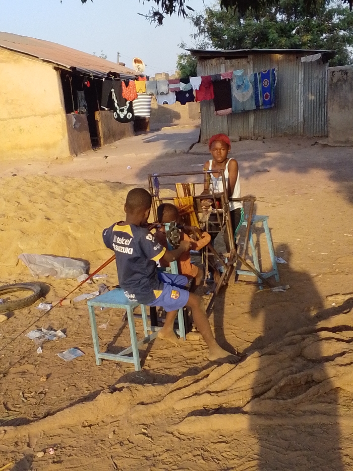 Three children engage with a makeshift Ferris wheel in a sandy yard. One child, wearing a soccer jersey and blue shorts, sits on a blue stool and operates the mechanism. Another child sits in the wheel while the third child stands behind it, appearing to push or guide the structure. Clothes hang on a line between two simple buildings in the background. The yard is littered with debris.