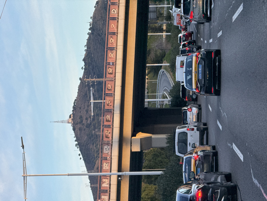 Traffic lines a multi-lane highway beneath a concrete overpass. Cars of various sizes and colors are visible, some appearing to be taxis. Beyond the overpass, a hill rises, topped with a tower-like structure. Light poles line the roadside, adding to the urban landscape. The sky is a pale blue, suggesting either early morning or late afternoon light. The scene depicts a bustling road with a backdrop of a hill and a distinctive tower.
