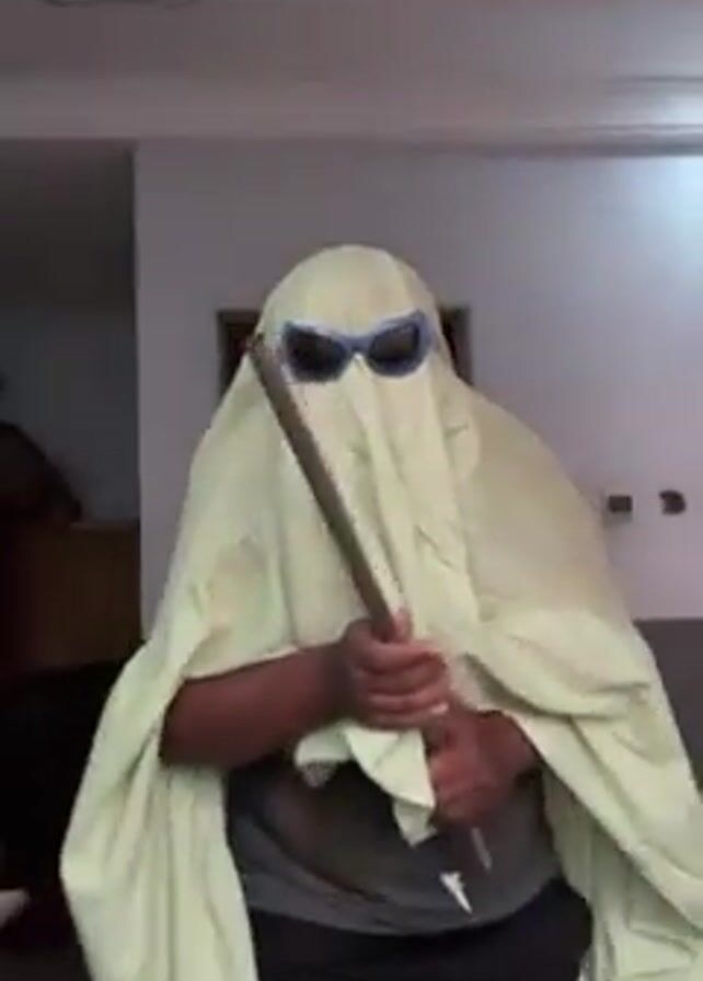 A person stands indoors, draped in a light green sheet, with blue sunglasses perched on the sheet where the eyes would be. The individual holds a silver metal pole. The person rotates and swings the pole in a mock martial arts style. The background shows a simple interior with white walls, a closed door, and some furniture in the periphery.