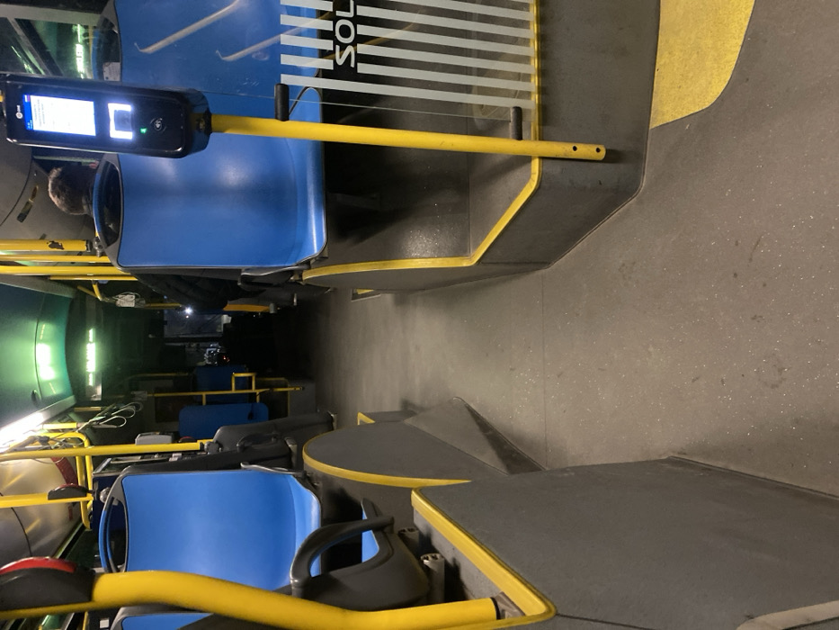 - "The interior of a public transport vehicle, operating within Zvezditsa, Bulgaria, is depicted from a low-angle perspective, looking forward down a central aisle" by FM-opJ3Q2, licensed under CC BY 4.0