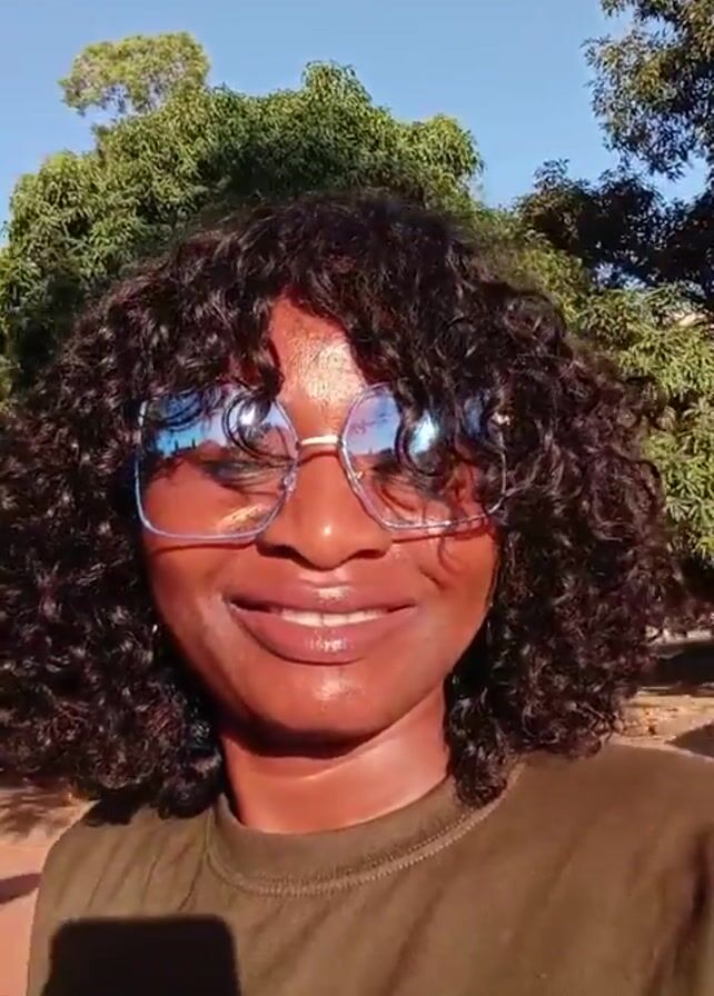 A woman is standing outside on a sunny day. She is wearing an olive-green t-shirt and large, square, blue-rimmed glasses. She has dark, curly hair. Behind her, there are green trees and a building in the distance. A car is also visible in the background. She smiles and looks at the camera.