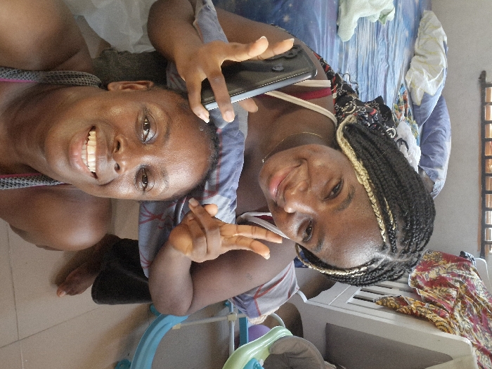 Two women pose closely for a selfie. One smiles widely, revealing teeth, while the other flashes a peace sign. The latter has dark braids highlighted with blonde streaks near her forehead. She holds a dark-colored phone, possibly taking the picture. They are indoors, near a baby walker and bed. The scene is bathed in natural light.
