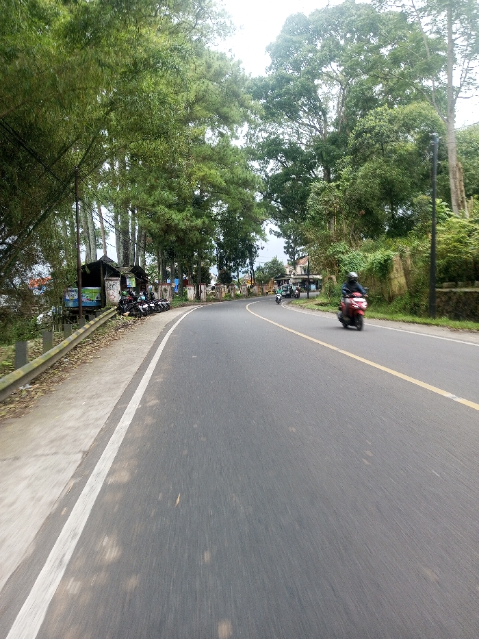 A winding asphalt road curves through a lush landscape, lined with tall green trees on both sides. A yellow center line divides the lanes. Motorbikes are visible, one closer with a rider, and others parked near a small roadside structure. A barrier runs along the left edge of the road, separating it from vegetation. The sky is overcast, casting a soft light on the scene.
