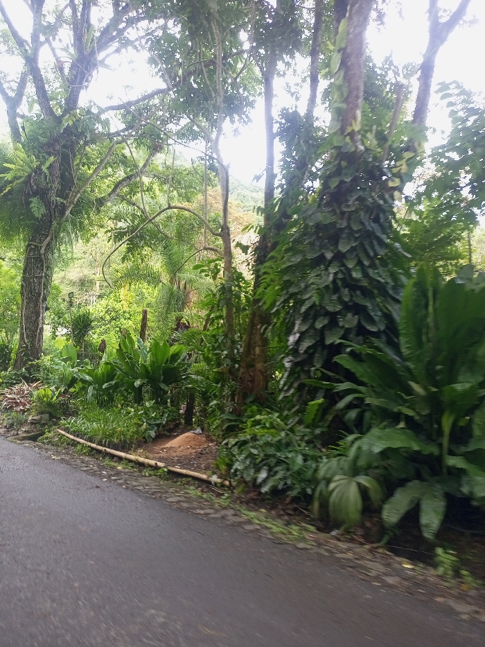 This image captures a lush, verdant roadside environment in Meyong, India. The foreground features a dark asphalt road, appearing damp, with a distinct, irregular stone or dirt edge on the right. A single bamboo pole, approximately 2 meters in length, lies parallel to the road along this edge, extending towards a small mound of light-colored dirt. The midground is densely populated with a variety of tropical foliage. On the left, a mature tree trunk is heavily covered with epiphytic ferns and other climbing plants. Towards the center, a prominent tree is almost entirely enveloped by large, heart-shaped, dark green leaves, indicating a vigorous climbing vine. Numerous broad-leafed plants, consistent with species found in tropical undergrowth, occupy the space between the road and the larger trees. No people, animals, or explicit actions are visible within the frame. The background reveals more dense tree cover and a bright, possibly overcast, sky with hints of a distant, light-colored hill or mountain. The overall scene suggests a humid, natural setting bordering a traveled path.