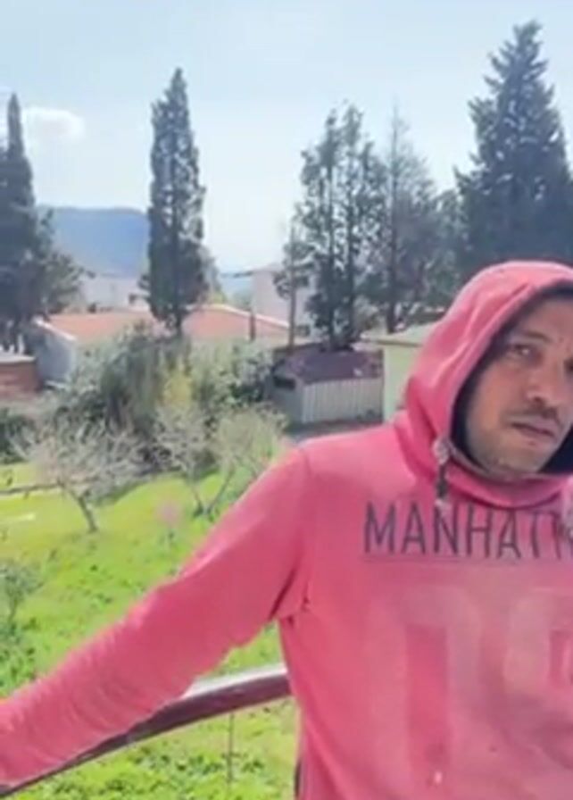 A man in a pink hoodie stands on a balcony. He is looking at the camera, facing to the left. Behind him, there is a view of a town, mountains, and trees. The camera moves to show the landscape behind the man in more detail. The scene is sunny with a clear sky. The buildings are mostly white with red roofs. There are tall, thin trees and other greenery. Mountains are visible in the distance.