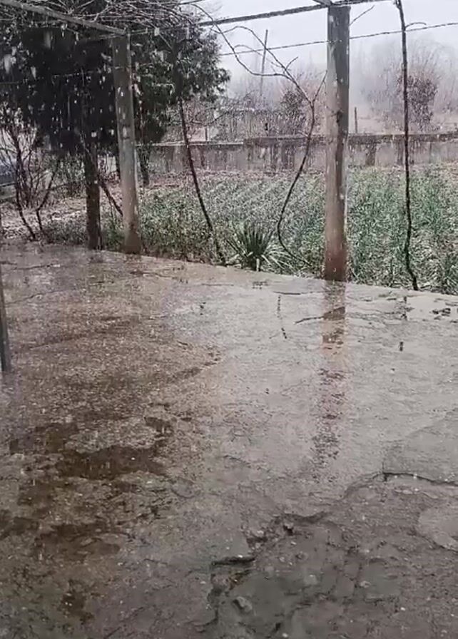 light snowfall on a concrete patio. The patio is cracked in places and wet. A metal pergola stands overhead, supported by four posts. In the background, there are shrubs, trees, and a fence. A child's voice is heard.