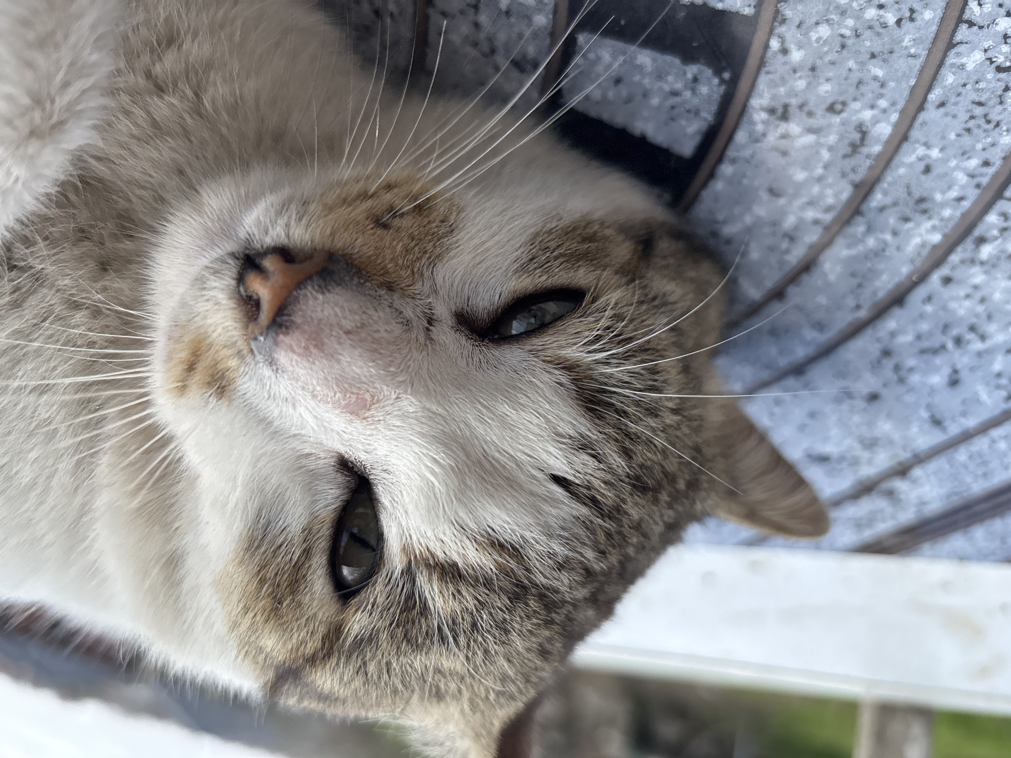 - "A close-up photograph depicts the head of a cat with white, brown, and grey fur" by FM-naVU72, licensed under CC BY 4.0