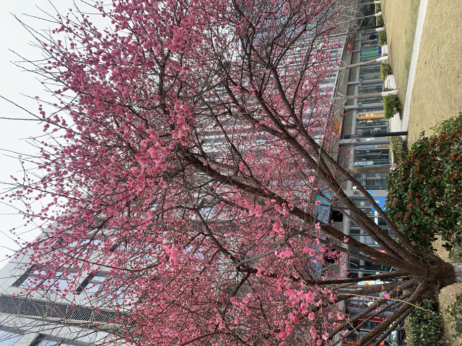 The image depicts an urban outdoor scene in Xihu District, China, characterized by a prominent flowering tree in the foreground. The central subject is a deciduous tree, likely a plum or cherry blossom, heavily laden with vibrant pink flowers, indicating springtime bloom. The tree's branches are dark brown and devoid of leaves, forming an intricate network across the upper and central portions of the frame. Beneath the tree, in the lower left, is a dark green bush with small red berries. To the right, a manicured lawn of green and dormant brown grass stretches towards the background. A paved pedestrian walkway runs parallel to a series of modern buildings in the mid-to-background. These multi-story structures feature grey and white facades with numerous glass windows, reflecting the overcast sky. The ground floors of these buildings appear to house commercial establishments with dark glass storefronts and some visible Chinese characters on signage, though illegible. A black streetlamp pole stands alongside the walkway in the midground. A dark-colored scooter or small motorcycle is partially visible behind the berry bush on the left. In the far right midground, a solitary, indistinct pedestrian figure is visible on the walkway. The sky is overcast and bright, providing diffused, shadowless illumination to the entire scene.