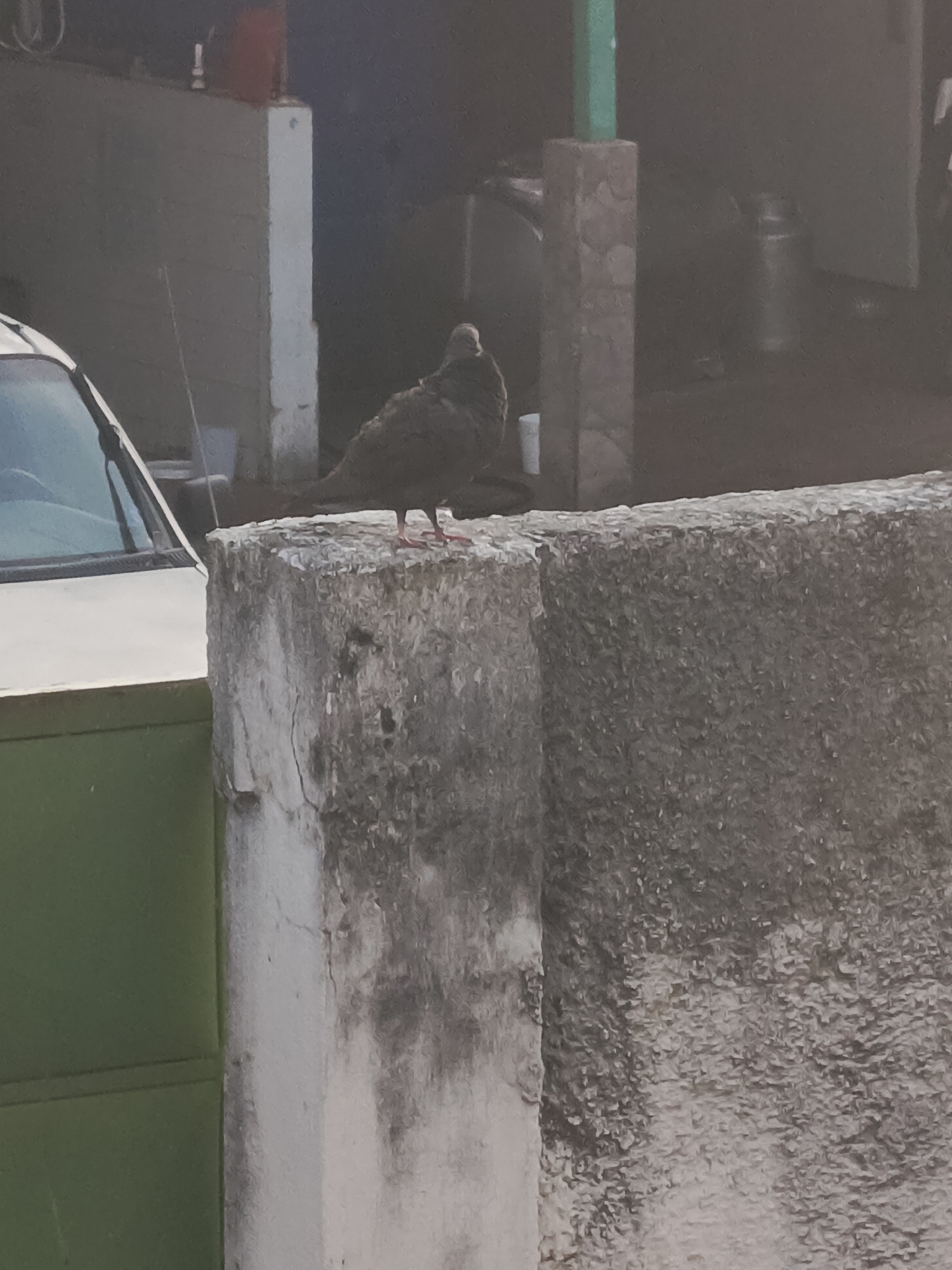 A bird, possibly a dove or pigeon, stands on a weathered concrete wall. The wall shows signs of aging with stains and cracks. Behind the wall, a partial view of a white vehicle is visible. A green door or panel is also seen beside the wall. The background suggests an urban or residential area, with obscured buildings and objects. The location is Tinaquillo, Venezuela.