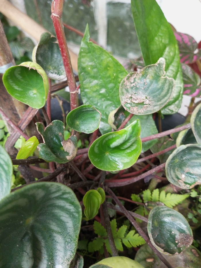 A close-up captures a vibrant collection of Peperomia plants. Their round, patterned leaves dominate the frame, interspersed with red stems. Some leaves show signs of damage or discoloration, while others are glossy and healthy. Fern-like plants peek out from the base of the stems, adding texture to the composition. The plants are close together in a pot, which is not visible.