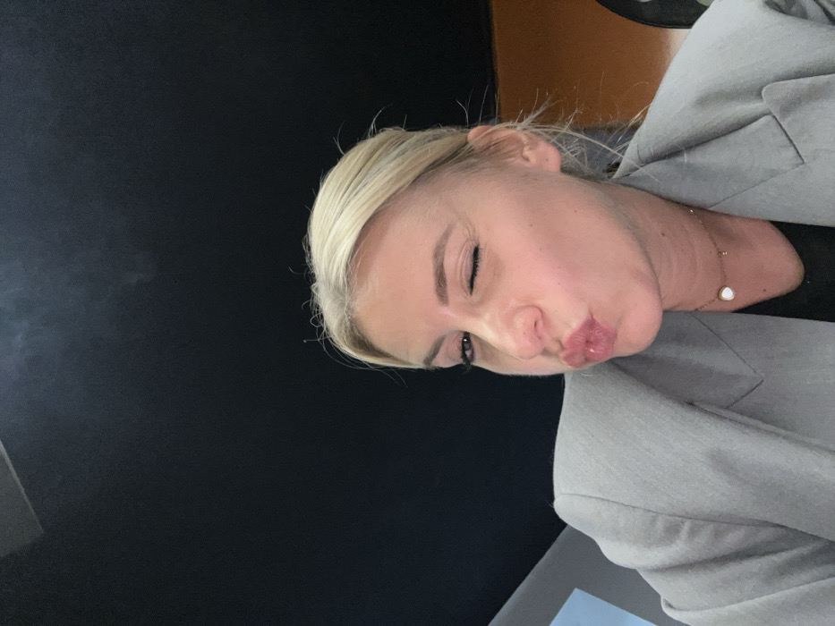 The image presents a close-up portrait of an adult female subject. The subject has blonde hair, light skin tone, and is shown winking with her left eye while pursing her lips. She is wearing a light grey blazer over a dark garment, and a delicate gold-colored necklace with a small, light-colored circular pendant is visible around her neck. The background is uniformly dark, appearing black or very dark grey, with subtle, indistinct reflections or light streaks present in the upper left area. A dark, curved object is partially visible along the right edge of the frame. The specific location within Saint-Médard-en-Forez, France, is not visually identifiable from the image content.