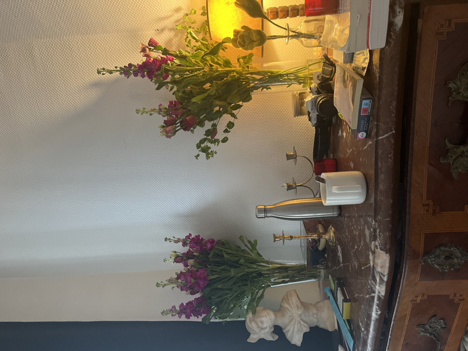 The image displays an interior scene, specifically a room located in Saint-Mandé, France. The central focus is the top surface of an ornate, dark wood dresser with a reddish-brown marble top. On the far left, a white bust of a woman with a head covering is visible, positioned beside a tall, clear glass vase containing a fresh bouquet of vibrant purple/magenta flowers with long green stems. To the right of the bust, a blue ruler and a small dark box rest on the marble. In the center of the dresser, a slender brass single-candle holder stands to the left of a silver, insulated water bottle. Adjacent to the water bottle is a white ceramic mug with a metal spoon inside, situated next to a small red glass or ceramic object. Further to the right, a brass candelabra with two candle holders, one containing a small white candle, is visible. On the right side of the dresser, a vintage Nikon camera with a lens and strap is placed on the marble. Behind the camera, a clear glass vase holds a large bouquet of pink and red flowers interspersed with green foliage. To its right, a smaller clear glass vase contains two yellow, fabric-like decorative flowers. A warm yellow-orange table lamp, partially obscured on the far right, illuminates this side of the scene. A stack of books or papers, with some red-colored objects, is visible in front of the lamp. The background consists of a textured white wall, with a dark blue wall or feature present on the far left.