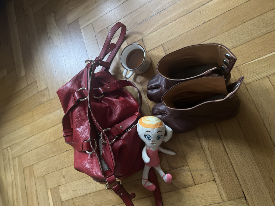An overhead view depicts several items arranged on a light brown herringbone parquet wooden floor. A red leather handbag, likely Gucci due to its embossed pattern, is positioned centrally, slightly open with a zipper visible, revealing some interior. To the left of the handbag is a small, light pink and white plush toy resembling a ballerina character with orange hair and blue eyes, lying on its back. To the right, a pair of dark brown or burgundy leather ankle boots, identifiable by their distinctive split-toe design as Maison Margiela Tabi boots, stand upright. Further to the right of the boots and behind the handbag, a white ceramic mug with a dark rim contains a dark liquid, possibly tea or coffee. The scene is illuminated by ambient light, casting subtle shadows. The specific location within Warsaw, Poland, cannot be determined from the visual evidence.