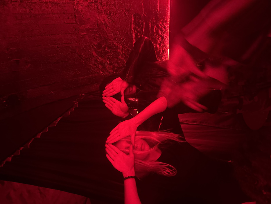 A red-toned, low-angle shot shows two figures reflected in a glossy surface. One figure, with blonde hair, lies with hands covering the face. Another figure, possibly male, is obscured by the reflection and hands. The reflection adds a distorted, symmetrical effect. The red lighting casts a surreal, almost eerie atmosphere. A wall with rugged texture is in the background, with the wall also affected by the lighting.