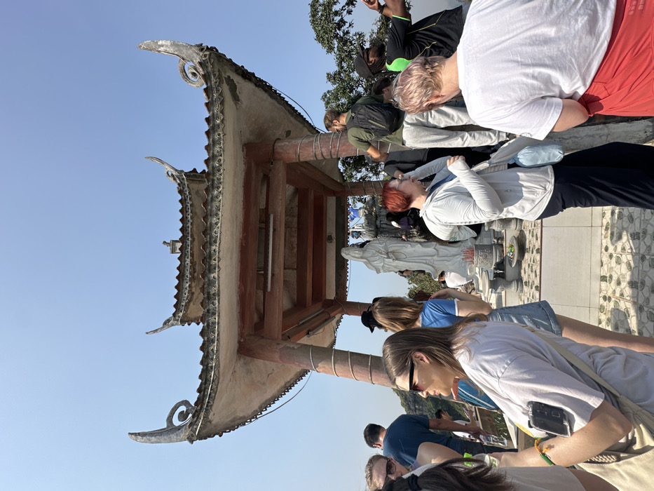 A pagoda-like structure is viewed from below with a group of tourists. The roof of the structure is decorated with curled, metallic elements. Several people are standing near a statue of a woman, potentially a religious figure, while others are looking over a ledge into the distance. The sky is clear and blue.