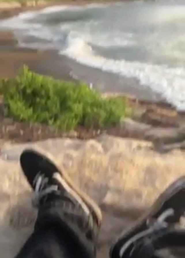 The video begins with a shot of a person sitting on a rocky cliff overlooking the ocean. The person is wearing black Vans shoes and dark jeans. The waves are crashing on the shore. The camera pans up to show the sky, which is a mix of blue and orange. The camera then moves to a person with long blond hair and wearing a purple shirt. The person smiles and makes the shaka sign with their hand.