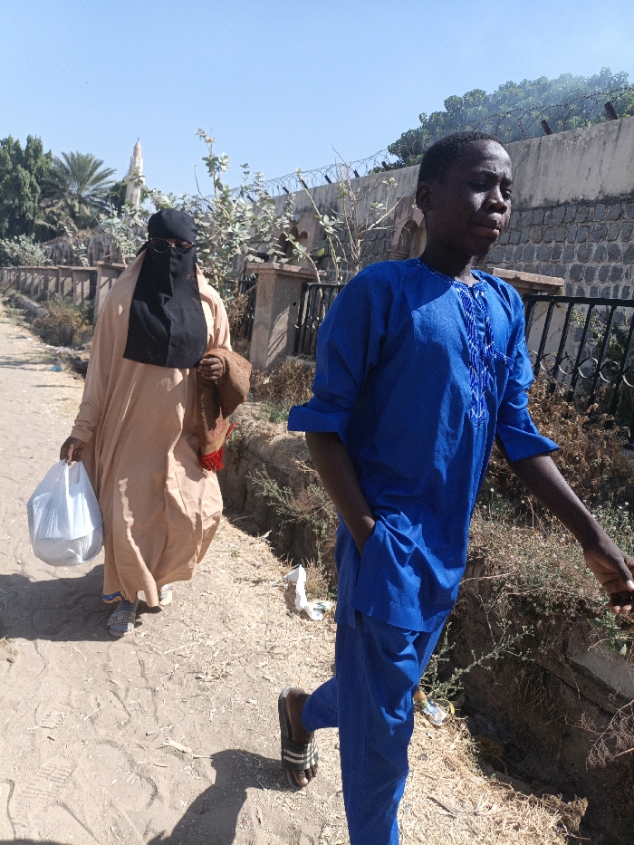 The image depicts an outdoor scene on an unpaved, dusty path in Tarauni, Nigeria, under a clear blue sky with bright sunlight. In the foreground, a young male, appearing to be a teenager, walks towards the right side of the frame. He is dressed in a vibrant blue traditional tunic with white and blue embroidery on the chest, matching blue trousers, and black and white striped slide sandals. His right hand is placed inside his pocket. Behind him and slightly to his left, an adult individual, identified as female by attire, walks in the same general direction. She wears a black full-face niqab, sunglasses, and a long, light beige abaya. She carries a white plastic bag in her left hand and a brown, possibly woven, fabric draped over her right arm. In the mid-ground, a light-colored, ornate mosque minaret with a green top is visible among trees and sparse vegetation. Along the right side of the path, a stone wall topped with barbed wire runs parallel to the subjects, featuring decorative arched sections. The ground is dry, with patches of withered vegetation and visible shadows.