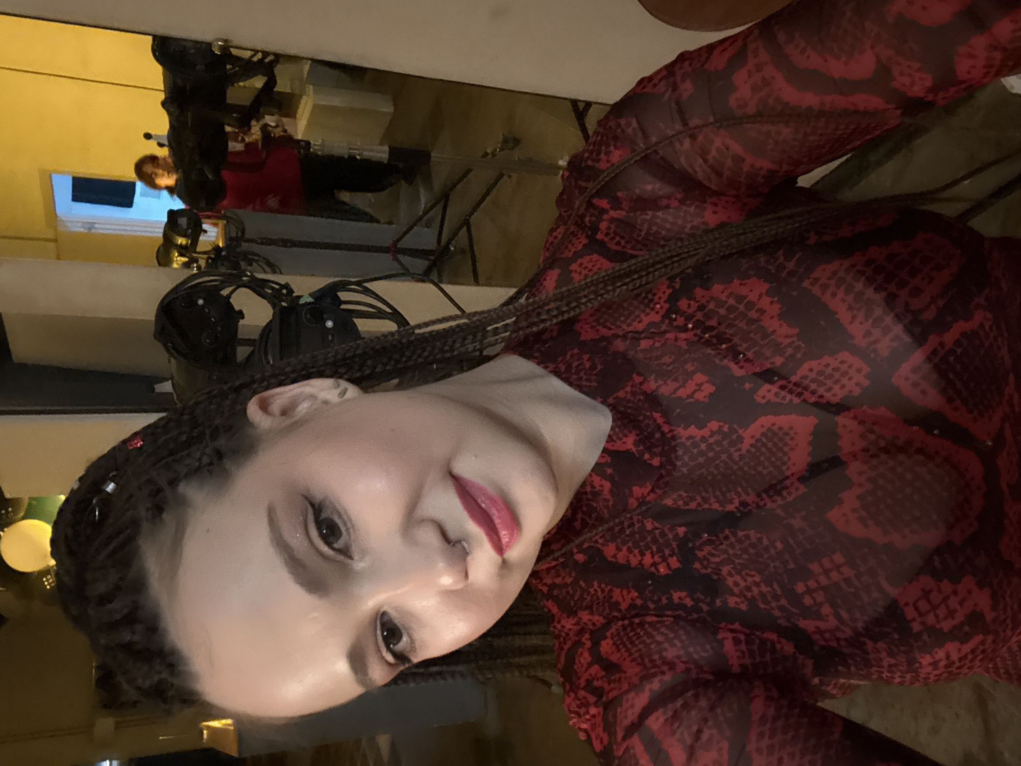 A woman with braided hair, wearing a red snakeskin-patterned top and lipstick, is the primary subject