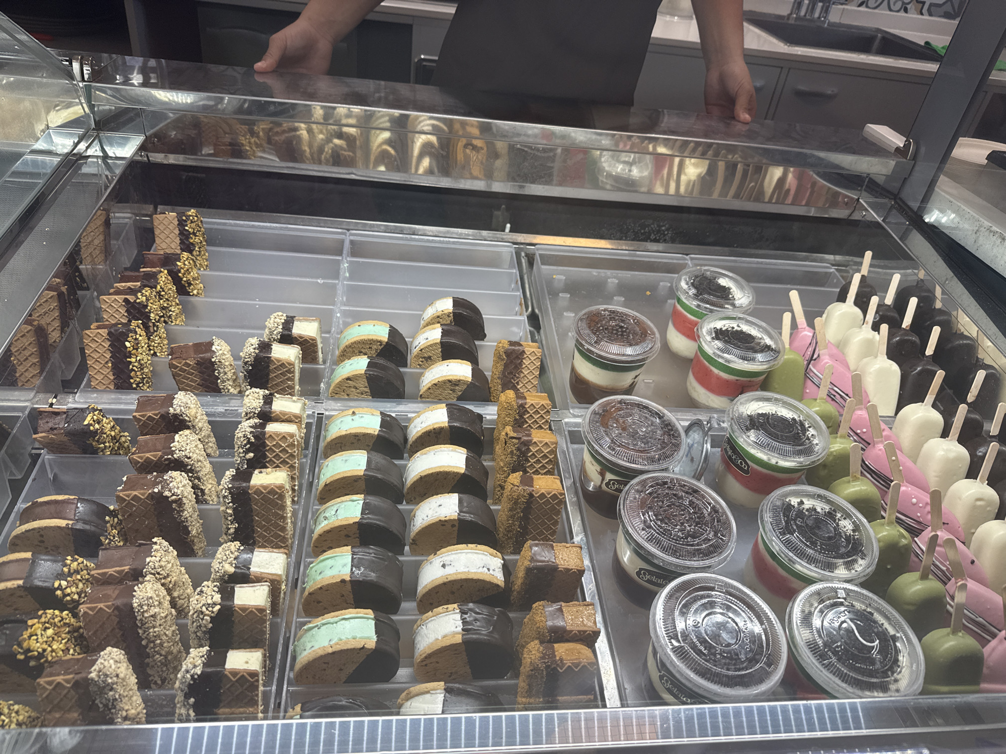 The image captures a display case in a gelato shop, showcasing a variety of frozen desserts