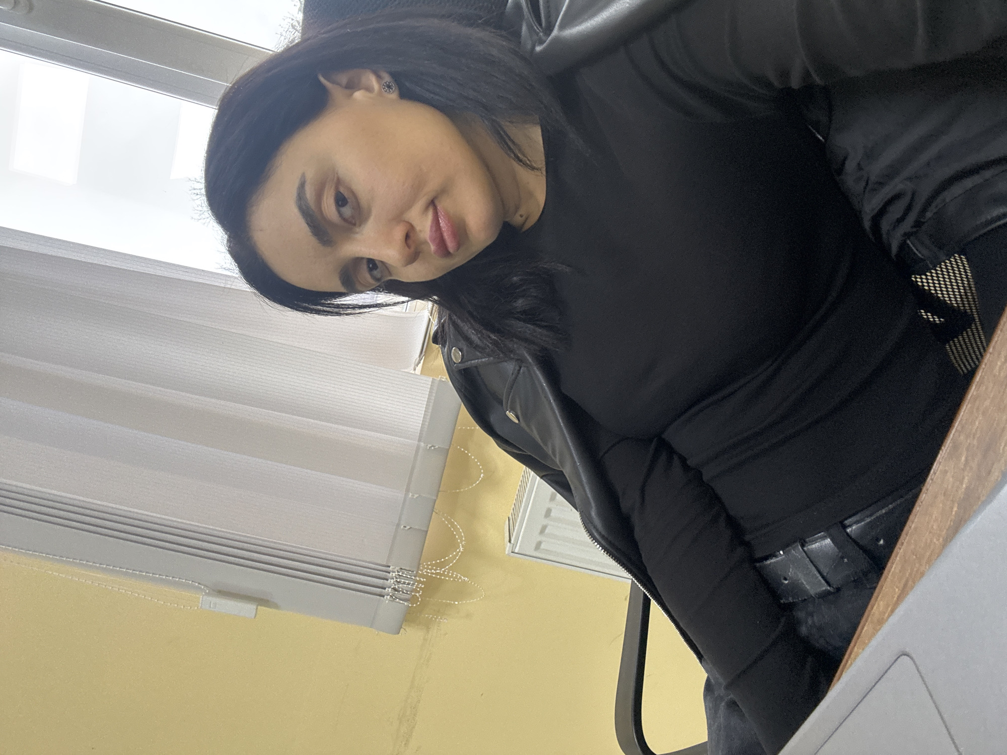A woman with dark hair and a black outfit is looking down at the camera in an indoor setting. The background includes a window with white blinds, and a yellow wall. The location is in Tbilisi, Georgia.