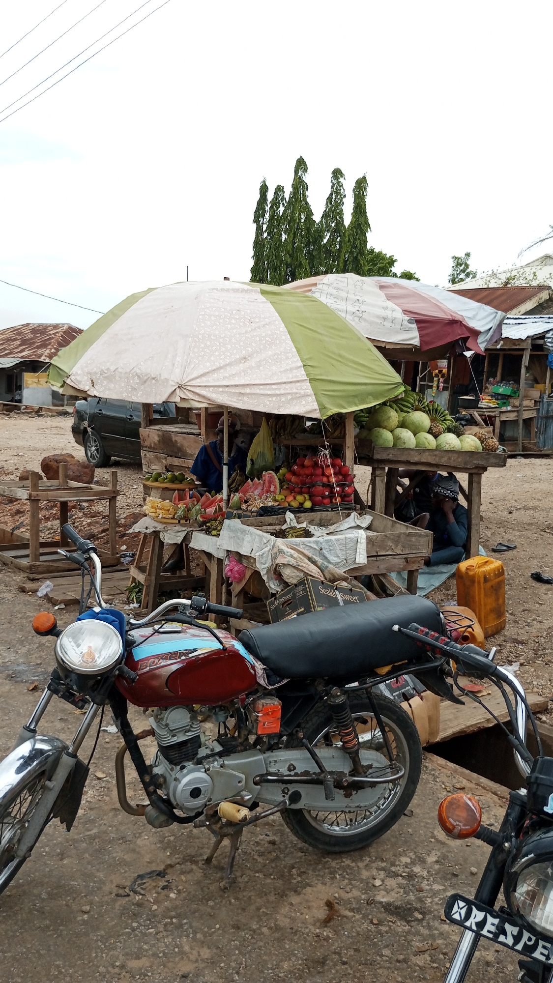 fruit stand in Zango-ndaji, Nigeria. A motorcycle is parked in front of the stand, with another partially visible on the right. The fruit stand has a green and white umbrella, displaying various fruits, including watermelons, bananas, apples, and other local produce. People are seen sitting and standing near the stand. A yellow jerrycan is on the ground near the fruit stand. A car is parked in the background. The ground appears to be dirt or gravel. Trees are visible in the distance. Other stalls and structures are adjacent to the fruit stand.