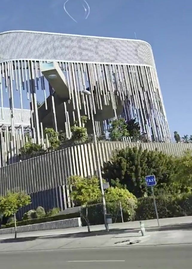 modern, multi-level building called Odisseo. The building's facade is characterized by vertical silver bars. There are several levels of balconies with greenery. A sculpture of a white dog wearing a scarf is visible on one of the balconies. A street runs in front of the building, with a sidewalk. There are some trees, a taxi sign, a parking sign, and a black car parked on the side of the road. The sky is blue and clear. The camera appears to be inside a vehicle, possibly a car or bus, which is moving.