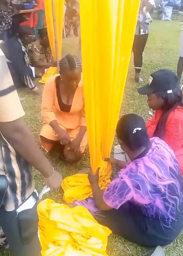Four people are kneeling on a grassy lawn, arranging yellow fabric around a vertical pole. Three of the people are women; one wears an orange dress, one a purple patterned top, and one a red top and baseball cap. A man is partly visible on the left side of the frame, wearing a light-colored shirt. Several other draped poles are visible in the background, along with more people and some folding tables and chairs.