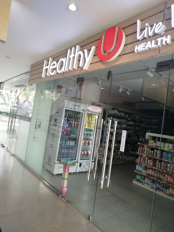 A storefront is visible with the name "Healthy U" in bold letters above the entrance