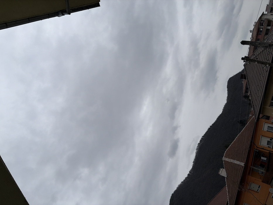 The scene is set in Etropole, Bulgaria. An elevated perspective captures a landscape under a heavily overcast sky, which dominates the upper two-thirds of the image with uniform gray clouds. Parts of two building structures frame the upper corners; a dark, angled eave in the upper-left, and a yellow-beige fascia board with a dark gutter and downspout in the upper-right. The mid-ground features residential buildings with pitched roofs covered in reddish-brown terracotta tiles. An orange-facade building in the lower-left displays multiple white-framed windows, some with closed roller shutters, and a small line of laundry hanging below a window. Utility poles with overhead wires are visible amidst the rooftops in the lower-right. In the background, a large, dark, forested mountain range rises significantly above the residential structures. No individuals or discernible actions are present.
