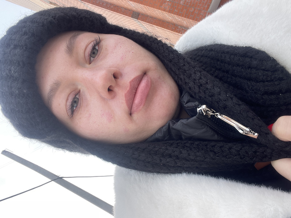 A close-up, selfie-style photograph depicts a woman outdoors in Фролы, Russia, looking directly at the camera. She wears a black knitted hat that covers her ears, a black knitted scarf, and a white faux fur coat over a black inner garment. A silver-colored zipper pull with an elongated, decorative design is visible on the black attire near her chin. Her light-colored eyes are prominent, and her lips exhibit a light pink cosmetic application. Her facial skin shows some superficial redness on the cheeks and around the nose. The background, slightly out of focus, features a pale, possibly overcast, sky on the left, with a dark diagonal pole and a thin black wire crossing it. On the right, a section of a red brick building facade is discernible. A hand with a red-painted fingernail is visible holding part of the black scarf in the lower left.