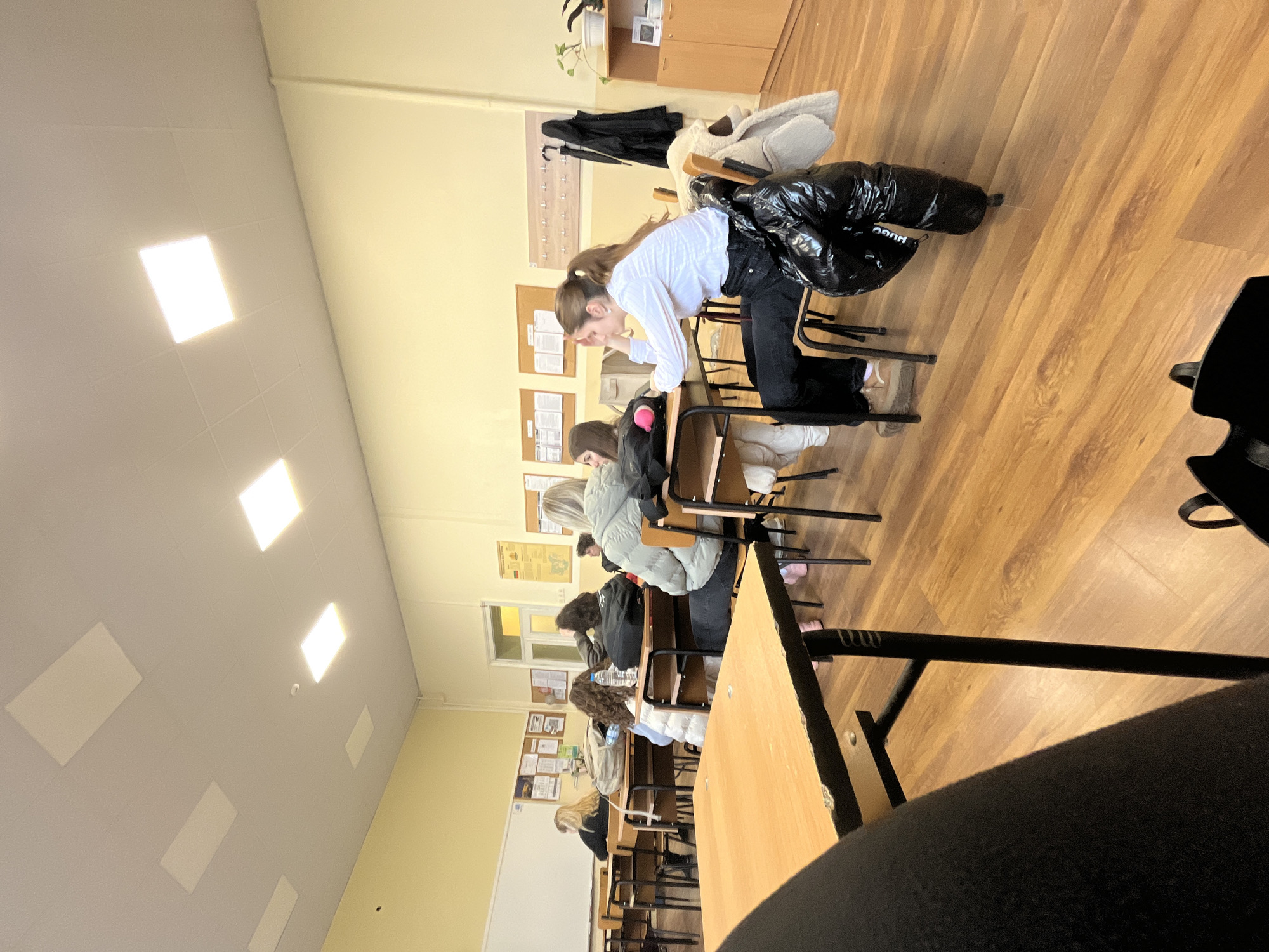 The image depicts a classroom setting, likely in a school or educational institution in Ruse, Bulgaria. The room is oriented with rows of desks and chairs. Students are seated at their desks, some engaged in activities suggestive of studying or classwork. A woman is standing at a desk in the foreground. Some students are wearing jackets and coats. Coats and jackets are hanging on a coat rack on the wall. The environment includes bulletin boards and a cabinet. The lighting is artificial and likely from ceiling fixtures. The scene is of an academic environment, filled with the standard elements of a classroom.