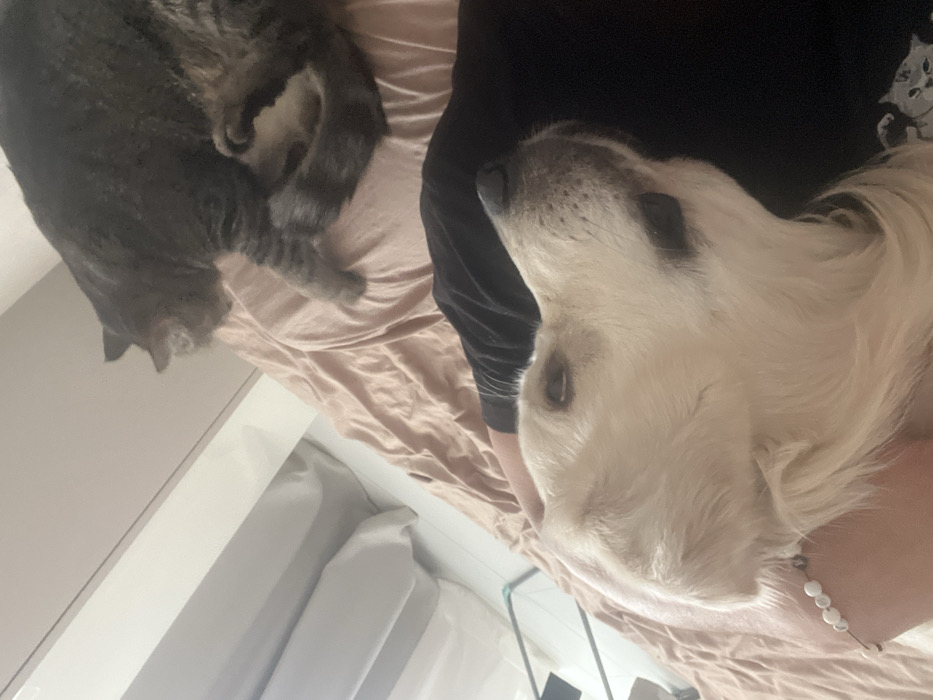 The image depicts an indoor scene in Izhevsk, Russia. A light-furred dog, possibly a Golden Retriever, is positioned in the foreground, resting its head on the lap or chest of an individual. The dog's muzzle points upwards and slightly to the right, with its eyes partially open. A human hand, wearing a white beaded bracelet, is visible on the dog's left side, engaged in petting. The individual is wearing a dark-colored garment. Behind and to the right of the dog, a dark grey tabby cat is present on the same surface, which is covered by light pink or peach bedding, indicative of a bed or sofa. The cat is partially obscured, facing generally away from the camera, with its back and striped tail visible. The background reveals a light-colored wall or headboard structure, white curtains, and a faint metallic drying rack with light blue components in the far left.