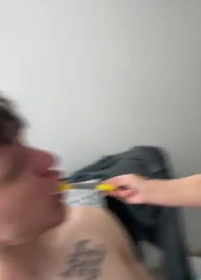 A short video shows a toddler and an adult interacting playfully. The video starts with the toddler shirtless and wearing a diaper, standing with his mouth open in a playful scream. The scene cuts to a shirtless adult with a tattoo on his chest, being tickled with a yellow object, possibly a back scratcher. The toddler reappears, his face now smeared with something white, possibly food, looking down and smiling. The room has white walls, a closed grey door, and a white refrigerator. A toy car is visible in the first shot.