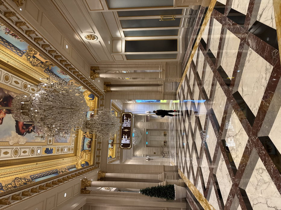 The image displays a brightly lit, ornate interior corridor, likely within a luxury establishment in Macao