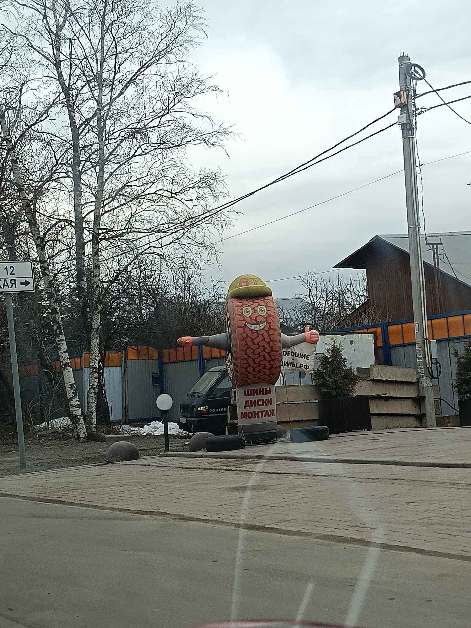 The image displays a street scene in Akulovo (Gp Kubinka), Russia, under an overcast sky. In the foreground, a paved sidewalk made of grey pavers borders an asphalt road. Centrally located on the sidewalk is a large, inflatable anthropomorphic tire figure, red-brown with visible tread patterns. The figure wears a green cap with yellow "BT" lettering, features a smiling face, and its arms are outstretched, with the right arm making a thumbs-up gesture. The base of the figure displays Cyrillic text: "ШИНЫ ДИСКИ МОНТАЖ" (Tires, Discs, Mounting). A partially obscured white sign behind the figure reads "ОРОШИЕ ИНЫ.РФ". To the left, a white street sign with "12 КАЯ →" is mounted on a pole, positioned in front of a cluster of bare birch trees. Behind the trees, a grey and orange corrugated fence partially obscures a parked dark Hyundai Porter pickup truck and a white spherical lamp. Further right, stacked concrete blocks and two small evergreen shrubs in dark planters are visible near a utility pole. The pole, equipped with an electrical box, supports multiple black wires. A building with a dark wooden facade and a dark roof stands in the background, behind the fence and pole. Patches of snow or slush are present on the ground. Two dark, round concrete bollards and a flat, dark circular object (likely a tire) are on the sidewalk. No human individuals are visible in the scene.