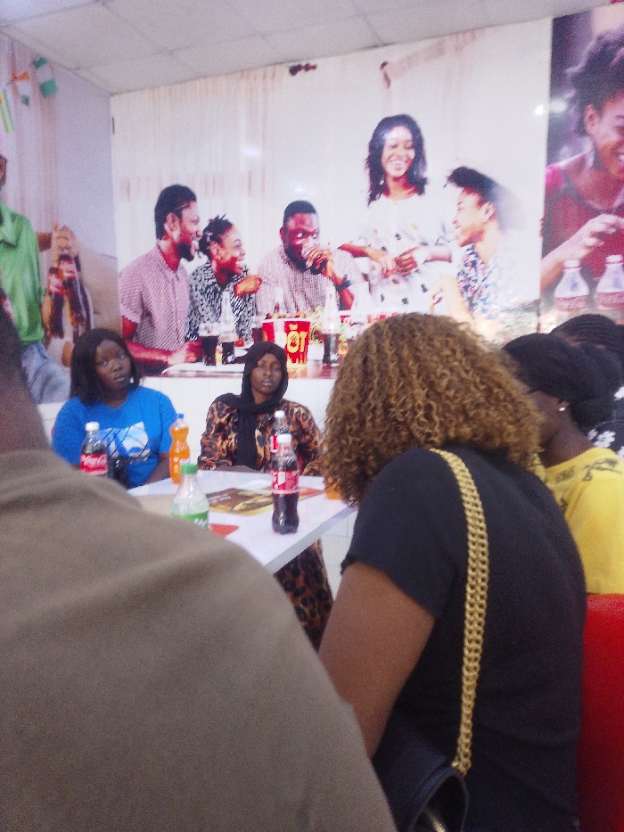 This image depicts an indoor establishment, likely a restaurant or cafe, located in Giginyu, Nigeria. In the immediate foreground, the back of a person wearing a brown or khaki shirt is partially visible on the far left. To the right, another individual is seen from behind, featuring shoulder-length curly brown hair and wearing a black short-sleeved top with a prominent gold chain strap over the right shoulder. In the midground, two women are seated at a white table. The woman on the left wears a blue t-shirt with a white graphic and has short dark hair, her gaze directed towards the right. Next to her, a woman in a black hijab and a long-sleeved leopard-print top is seated, looking towards the left. On the white table, multiple plastic beverage bottles are arranged, including Coca-Cola (red label), Fanta (orange bottle), and a green-labeled soda. A red bucket marked "OT" and a folded paper item, possibly a menu or flyer, are also on the table. A third person in a yellow top is partially visible to the far right, seated and facing away from the camera. The entire background is dominated by a large promotional banner or mural. It features several smiling individuals, primarily young adults, socializing and consuming beverages in a group setting. Elements like Coca-Cola bottles and a red bucket are discernible within the poster's imagery. Decorative bunting in green and white, resembling the colors of the Nigerian flag, is visible on the left side of the background poster. Red upholstered seating is present on the right side of the midground. The scene is evenly lit by interior lighting.
