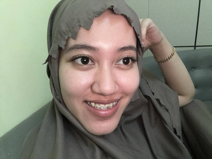A young female subject is depicted indoors in a close-up, likely in Gadingrejo, Indonesia. She has a light complexion, dark eyes, and a visible smile displaying dental braces on both upper and lower dental arches. She is wearing a greyish-green hijab with a scalloped edge. Her right forearm is visible, bent at the elbow, and a gold-toned chain-link bracelet is present on her right wrist. The subject's gaze is directed slightly off-camera to her right. The background consists of a light green wall section on the left and a portion of a grey upholstered sofa on the right, with a dark vertical line appearing behind the subject's right arm.