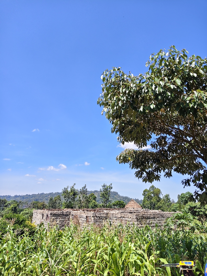 The image depicts an outdoor daytime scene in Kaplerartet ward, Kenya, characterized by a clear blue sky with sparse white cumulus clouds. In the foreground, a dense field of green maize (corn) plants occupies the lower half of the frame. Partially visible in the lower right, within the maize field, is a yellow and black device with a small screen, possibly a sensor or measurement tool, affixed to a dark pole or handle. The midground features a rectangular, unfinished or dilapidated structure constructed from large, rough-hewn grey stones, lacking a roof and with incomplete upper wall sections. Behind and to the right of this stone structure, a traditional conical thatched roof is visible, partially obscured by green trees. The background consists of a horizon line of densely forested hills or mountains under the bright sky. No individuals or specific human actions are observed.