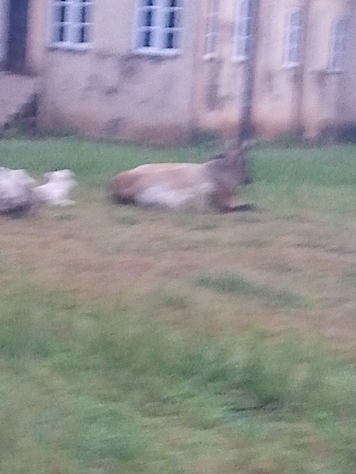 The scene is an outdoor grassy area in the city of Ihiagwa, Nigeria, situated in front of a building. In the midground, a light tan-to-brown ungulate, likely an antelope or deer, lies prone on the mixed green and brown grass, its head slightly elevated. To its left, two smaller, light-colored, indistinct forms are also present on the grass, one resembling a resting small white animal, possibly a goat or lamb. The background features a light-colored building with multiple rectangular windows, some displaying horizontal and vertical divisions.