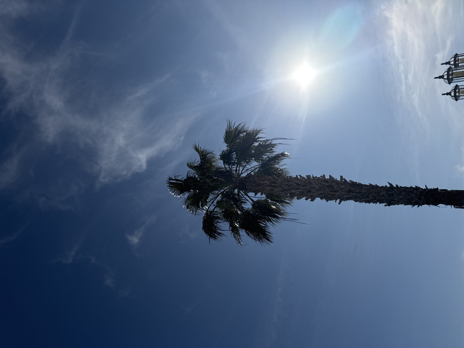 The scene depicts an outdoor environment in Fuente Álamo de Murcia, Spain, under bright daylight conditions. A tall palm tree, silhouetted, occupies the central and left portions of the frame, extending upwards from near the bottom edge. Its trunk is dark and textured, while its fronds at the crown are also dark and appear spiky. The sky is a clear, medium blue, with sparse, wispy cirrus clouds present in the upper left and upper-middle sections. The sun is positioned in the lower-right quadrant, appearing as an intense white light source, generating a prominent starburst lens flare that extends across the lower-right and mid-right areas, characterized by concentric rings of blue, green, and yellow light. In the lower-right corner, partially obscured by the sun's glare, are the dark, silhouetted forms of three ornamental street lamps or light fixtures, each featuring a tiered structure with visible finials. No individuals are present in the image.