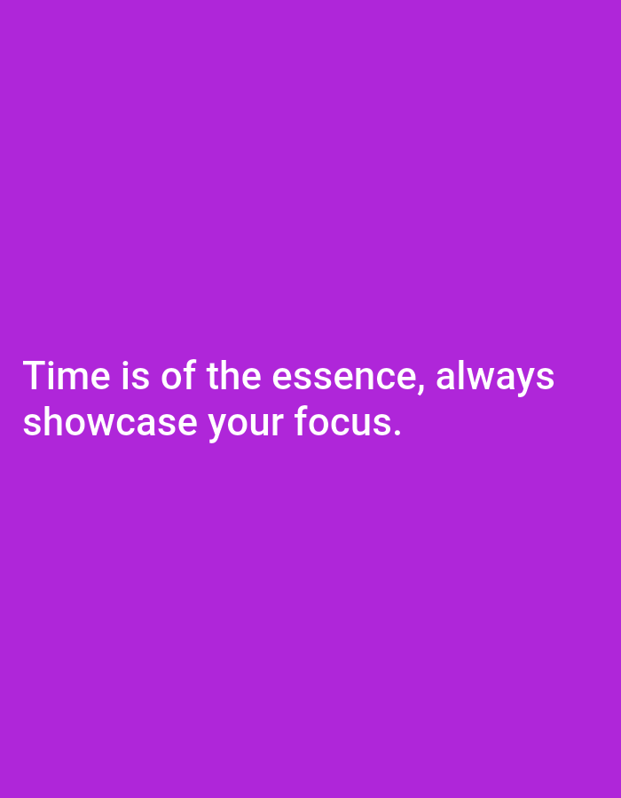 The image displays a uniform, solid purple background. White sans-serif text is horizontally centered and positioned in the lower half of the frame. The text reads: "Time is of the essence, always showcase your focus." There are no individuals, discernible objects, actions, or interactions depicted. The visual content provides no information regarding a physical location within the city of Jos, Nigeria, or any other geographical area. The environment is a digitally rendered color field.