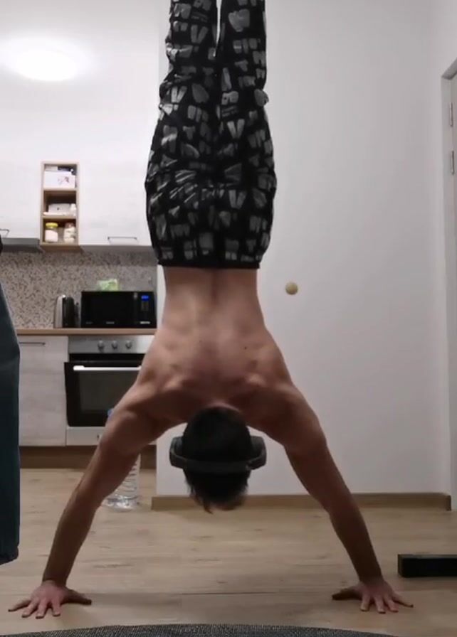 - "A shirtless man with dark hair, wearing dark patterned pants and pink socks, performs a handstand on a gray rug in what appears to be an apartment" by FM-IpIPL2, licensed under CC BY 4.0