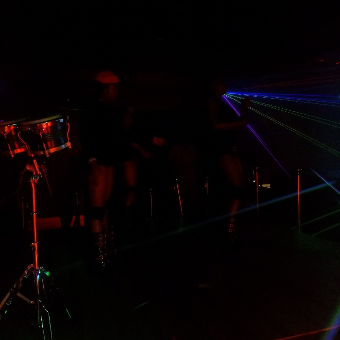 A dimly lit stage features two performers in the background, standing near stanchions. Colorful laser lights illuminate the scene. In the foreground, a set of timbales stands to the left, lit in red. The overall atmosphere is dark, with the performers and stage details barely visible.