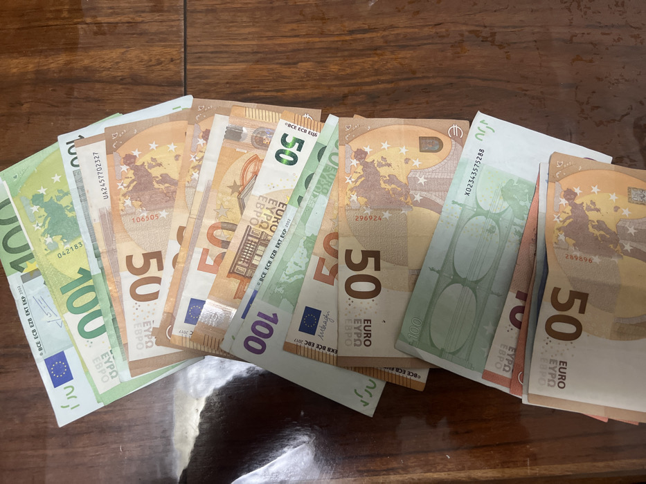 - "A collection of Euro banknotes is displayed fanned out and overlapping on a glossy, dark brown wooden surface" by FM-PhdGF3, licensed under CC BY 4.0