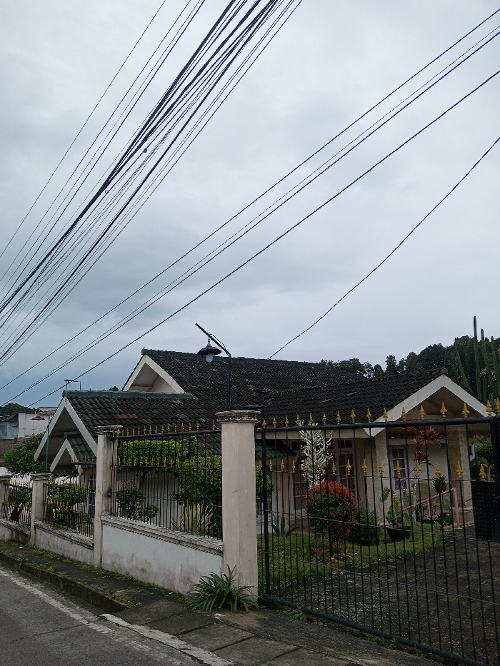 This image presents a street-level view of a residential property in Ambakirano, Madagascar, under an overcast sky. Numerous black electrical or communication wires stretch diagonally across the upper frame, originating from the upper left and extending towards the right. A paved road, complete with a concrete curb and sidewalk, occupies the lower left. Directly behind the sidewalk, a low concrete wall with an integrated black metal fence defines the property boundary. This fence features ornamental golden spikes along its top and includes a black metal gate section on the right. Two light-colored concrete pillars support the fence. Behind the fence lies a garden area containing various shrubs, green foliage, and tall, columnar cacti visible on the far right. A single-story house is set back within the property, featuring multiple gabled roofs covered in dark green tiles. The house exterior is light-colored, with windows trimmed in gold accents. A black street lamp on a pole extends above the house roofline. In the background, additional trees and distant hills are discernible. No individuals or specific activities are observed.