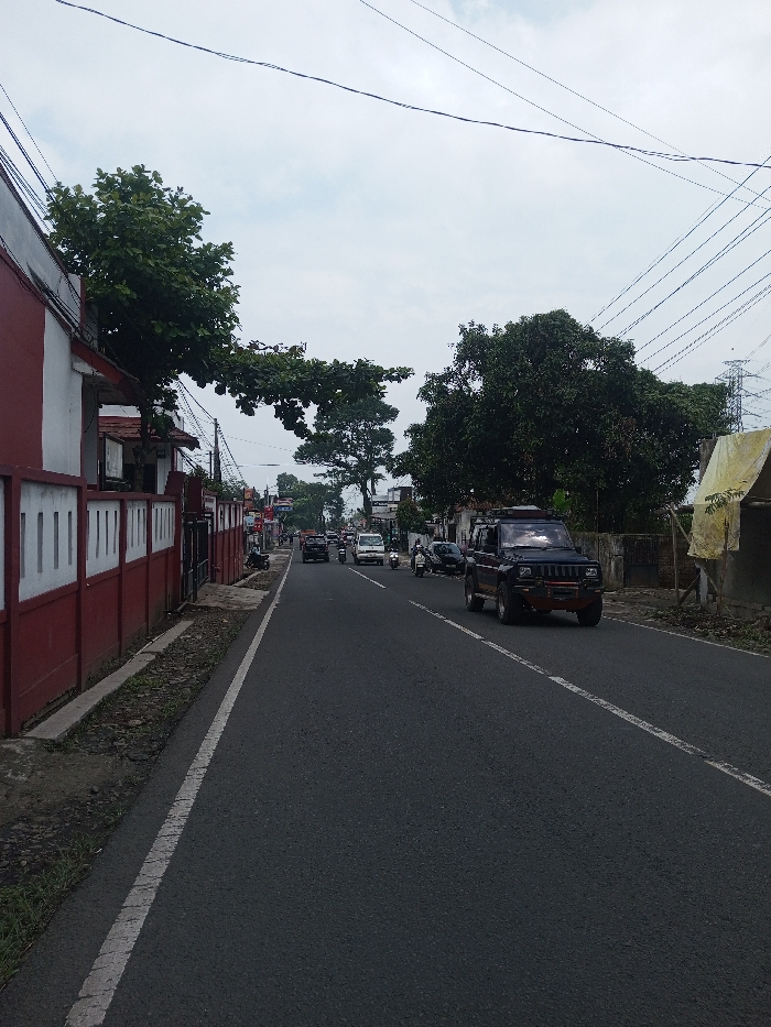 An overcast day shows a road with a car in the foreground. Several other vehicles, including a white van, are further down the street. Buildings and trees line the sides of the road. Power lines are visible above. A red and white building is on the left and a simple structure, possibly a shelter, is on the right. The road is marked with a white line.